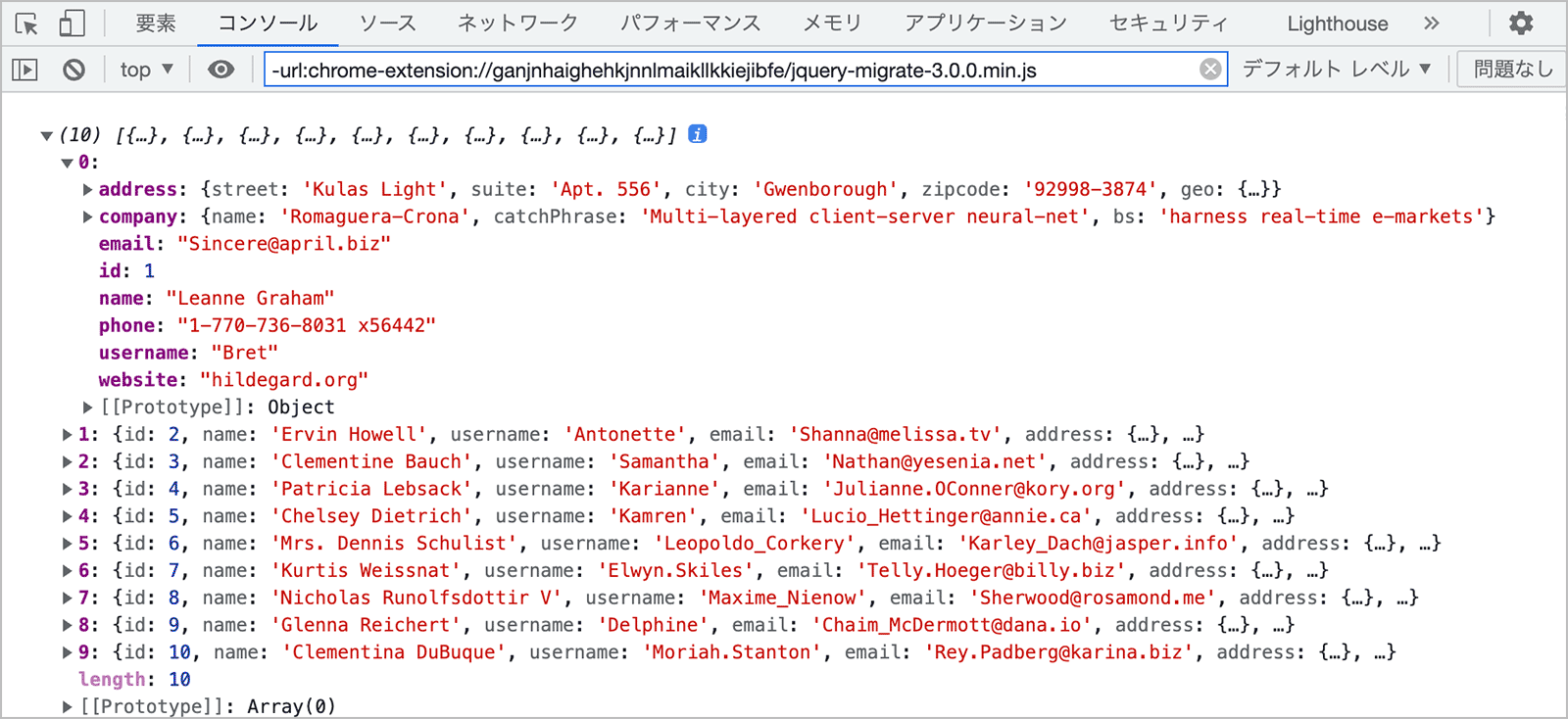 上記の場合、URL に指定した API は JSON 形式のダミーのユーザーデータを10件返してくれるので、コンソールを確認すると以下のような架空のユーザーデータが表示されます。