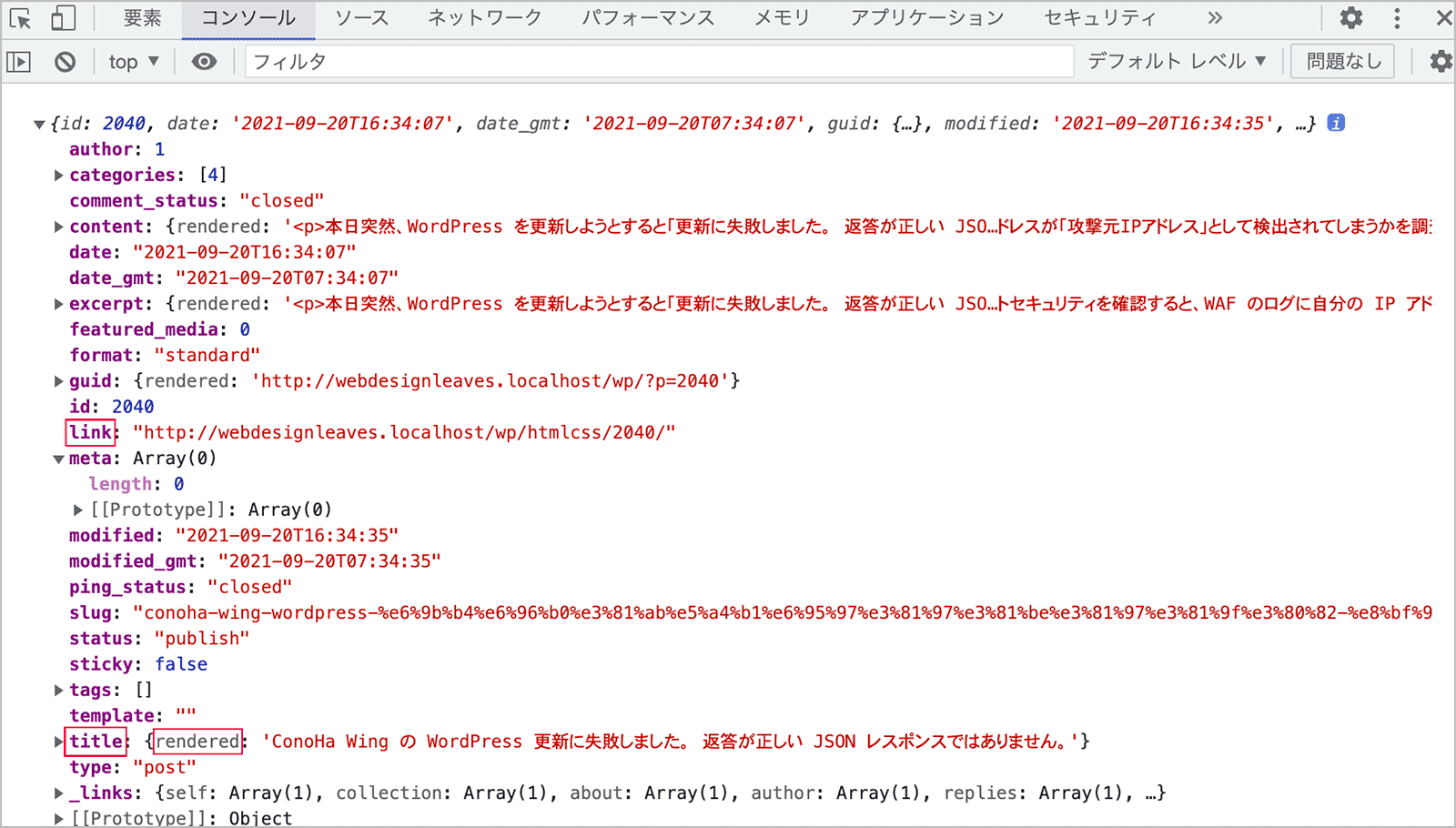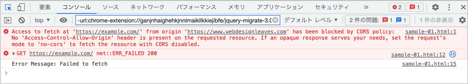エラーの内容は「https://www.webdesignleaves.com から https://example.com/ にフェッチするためのアクセスは CORS ポリシーによってブロックされています。Access-Control-Allow-Origin ヘッダーがリクエストされたリソースに存在しません」というような意味になります。