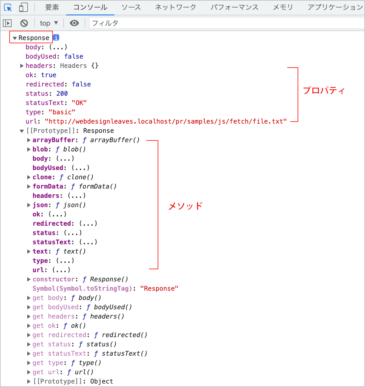 上記の場合、fetch() メソッドで取得した結果(Response オブジェクト)は response として2行目の then() メソッドのコールバック関数の引数に渡されます。