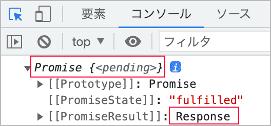 リクエストが完了するとリソースが利用可能になり、その時点で、Promise は Response オブジェクトに resolve(解決)されます(結果の値として Response オブジェクトが返されます)。